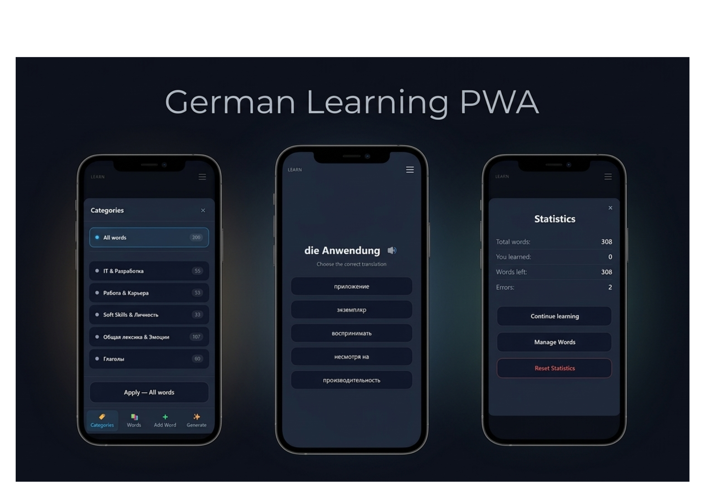 My small pet project: A German vocabulary Progressive Web App (PWA) with offline-friendly learning, word categories and learning statistics. Built with JavaScript PWA features and local data storage.